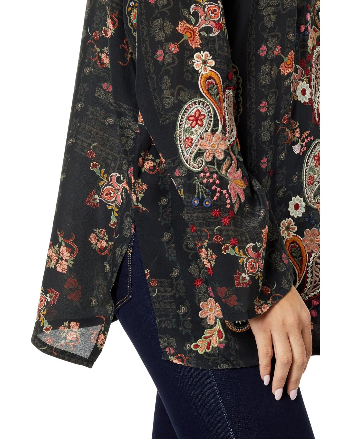 There is no way to avoiding the attention when wearing the chic and elegant, Johnny Was Lori Blouse. With it's beautiful all over embroidery that mixes floral and paisley motifs on a relaxed fit silhouette relaxed-fit you'll wish you could wear it everyday.