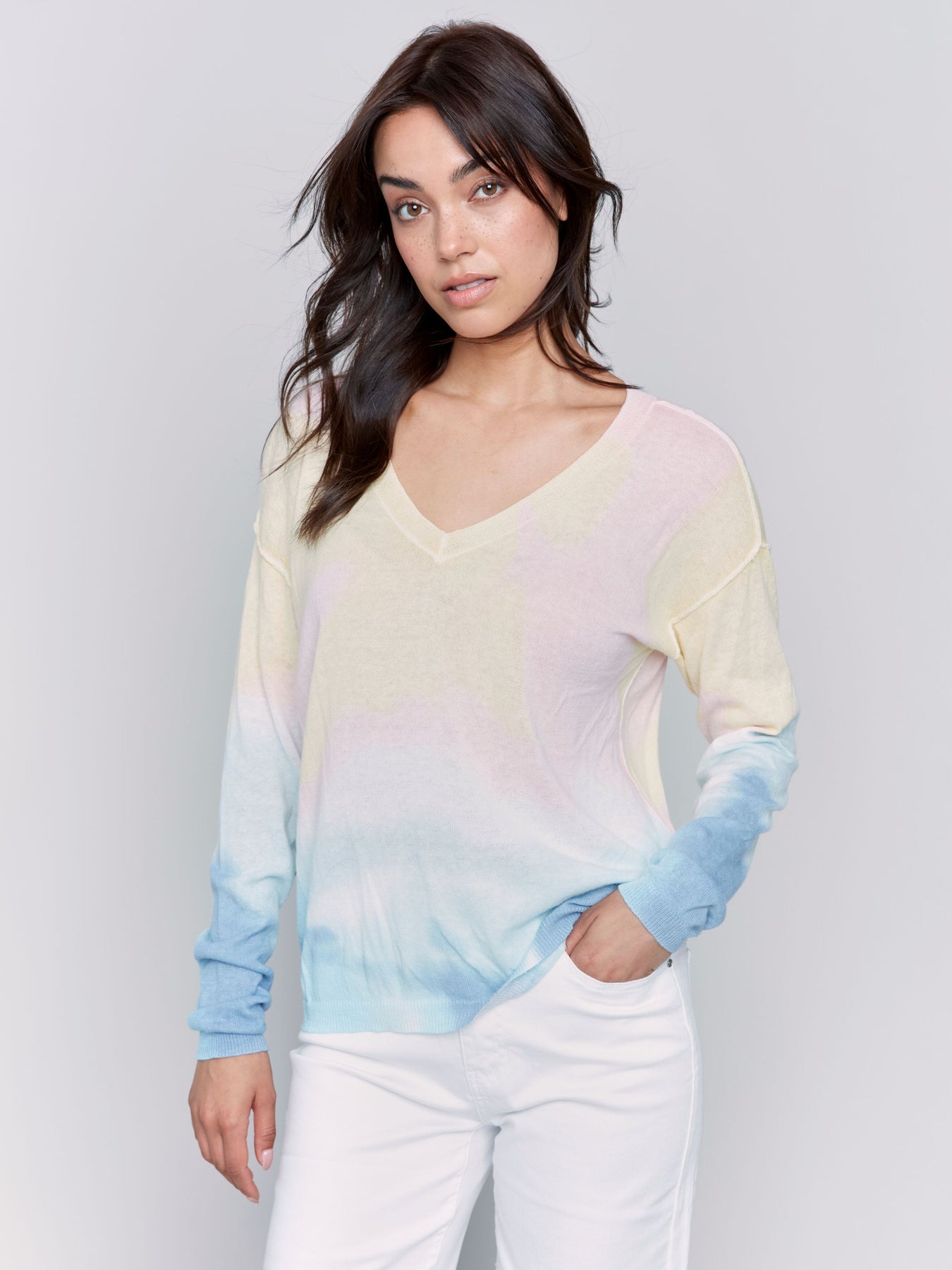 Elevate your style with this printed V-neck knit top, featuring a unique pastel inspired tie-dye print. The relaxed fit and soft, fine-knit fabric combine style with comfort. Whether running errands or meeting friends for coffee, it's the perfect blend of cute and cozy.