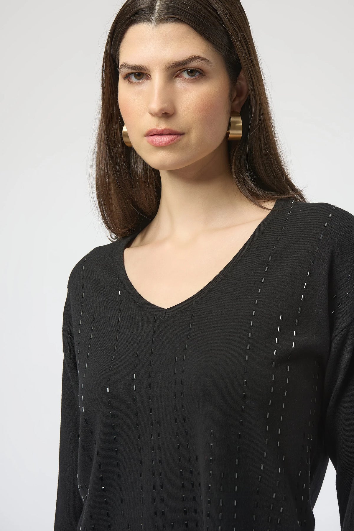 This Joseph Ribkoff pullover combines simplicity with sophistication through its V-neck design and refined iron-on front detailing. The high-low hem and side slits create graceful movement, while the long sleeves and straight silhouette provide comfortable wear throughout the day. Ideal for those seeking understated elegance with expert craftsmanship.