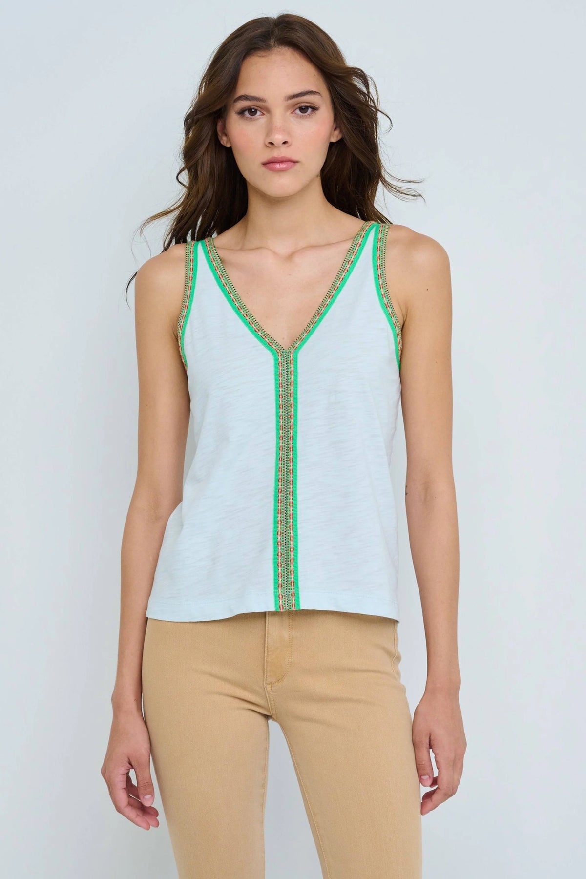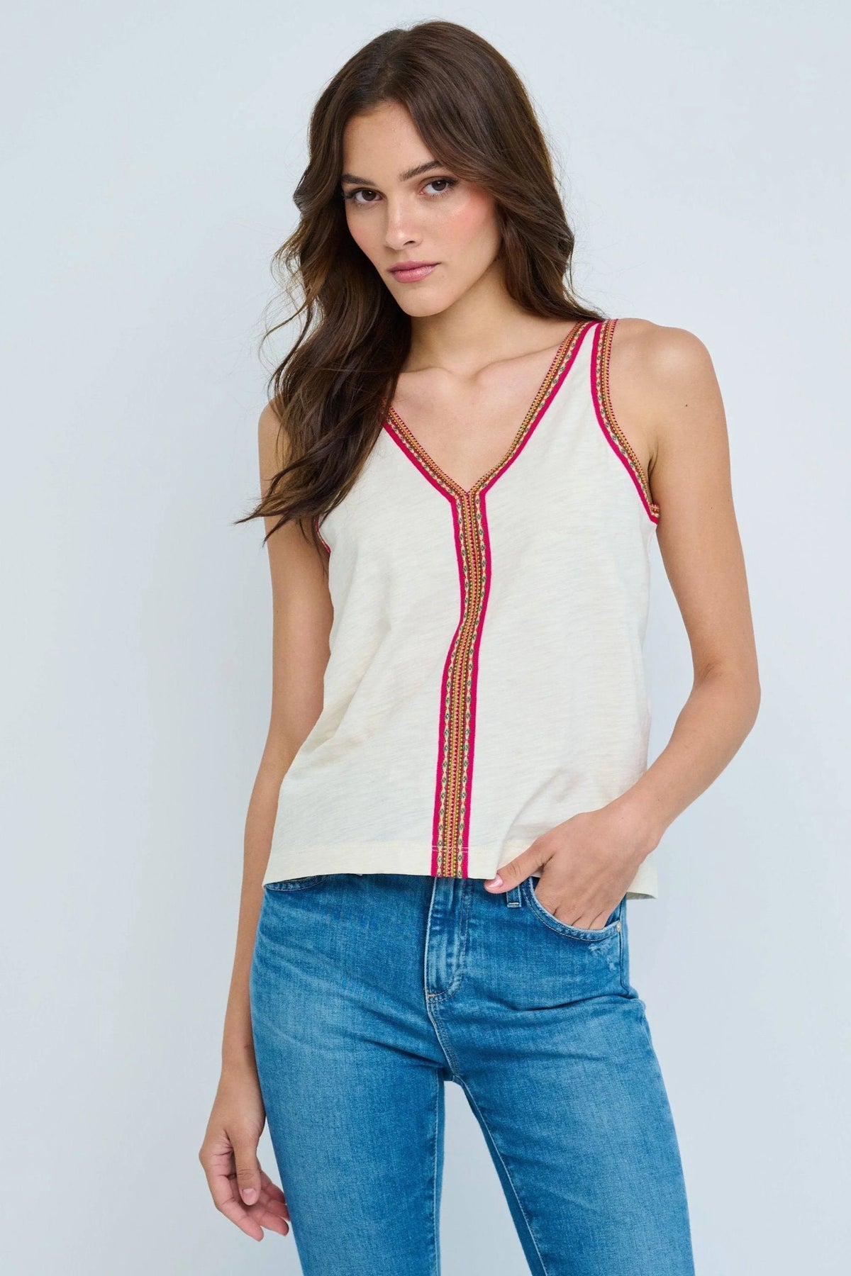 The In A Tizzy V-neck Cotton tank takes a classic, simple style and elevates it with an intricate contrast embroidery trim along the neckline and down the center front.