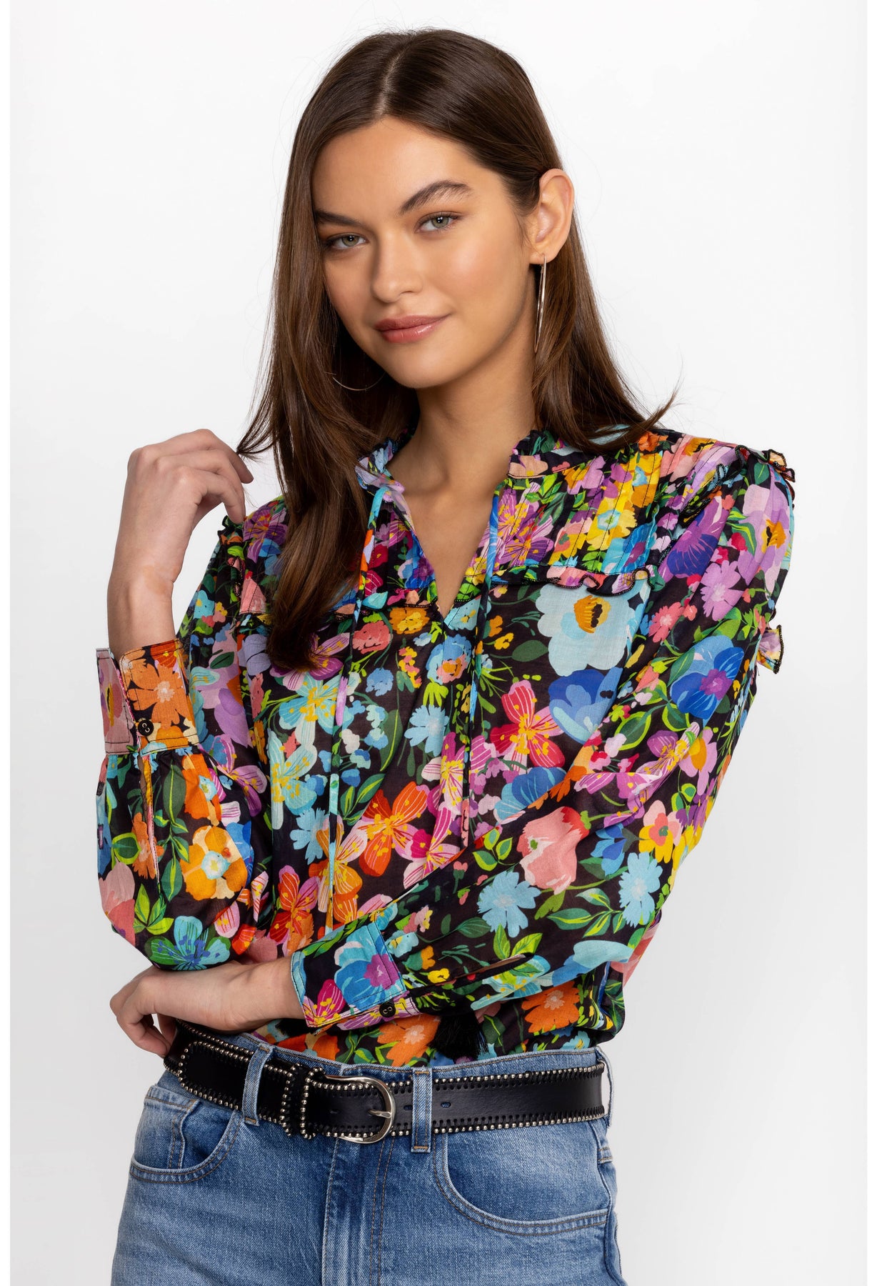 With a beautiful interplay of patterns and tones, The Wild Bloom Ruffle Yolk Blouse from Johnny Was is a timeless wardrobe essential. Crafted in 100% cotton with a split neckline, a defined yoke with ruffled embellishment, this blouse is brimming with style.